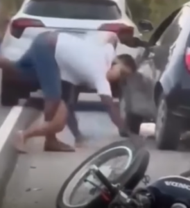 Uma colisão intencional entre um carro e uma motocicleta na Rodovia Pedro Merizio terminou em agressões físicas entre os envolvidos. Vídeos que circulam nas redes