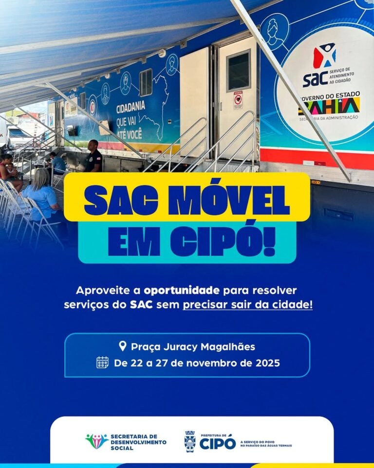 O SAC Móvel chega a Cipó entre os dias 22 e 27 de novembro, oferecendo à população diversos serviços do Sistema de