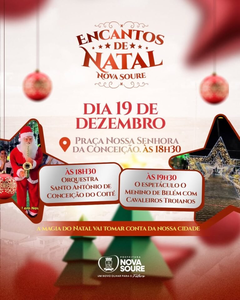 A cidade de Nova Soure receberá o evento Encantos de Natal no dia 19 de dezembro, a partir das 18h30, na Praça