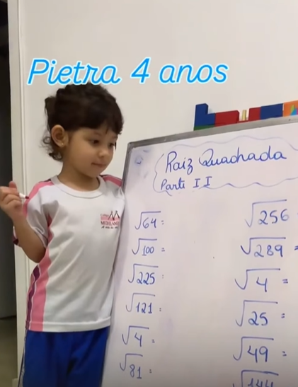 A pequena Pietra Garcia, de 4 anos, voltou a chamar atenção por seu desempenho acadêmico. Natural da Bahia, a menina conquistou medalha de bronze em uma competição internacional de matemática após já ter batido um recorde brasileiro ao soletrar 32 palavras em um minuto.