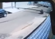 Câmeras de segurança registraram o momento em que uma mulher, que pilotava uma moto, foi surpreendida pela queda de um poste. O objeto despencou repentinamente e atingiu a motociclista, que caiu no chão com o impacto.