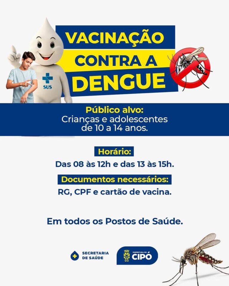A Secretaria Municipal de Saúde de Cipó informou que a vacina contra a dengue está disponível em todos os postos de saúde