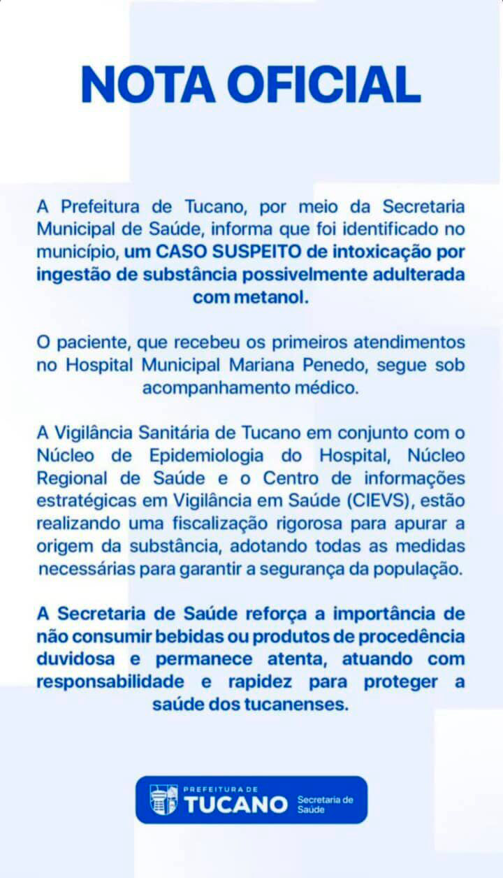 Prefeitura de Tucano investiga possível caso de intoxicação por metanol