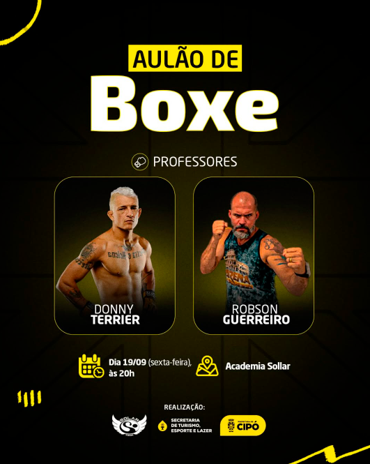 A cidade de Cipó receberá, nesta sexta-feira (19), um aulão especial de boxe com os professores Donny Terrier e Robson Guerreiro. A atividade está marcada para às 20h, na Academia Sollar, e promete movimentar os amantes do esporte com muita técnica e energia.