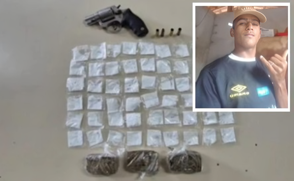 Com o suspeito, os policiais apreenderam um revólver calibre 38 com três munições deflagradas e uma picotada, além de 52 papelotes de substância análoga à cocaína e três tabletes de maconha, totalizando 165 gramas.