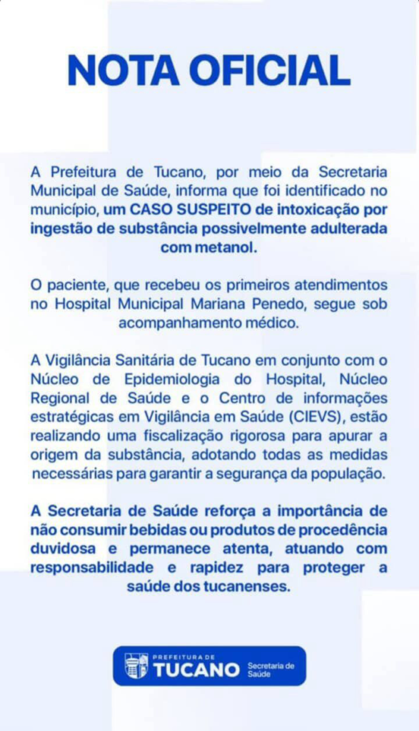 A Prefeitura de Tucano, por meio da Secretaria Municipal de Saúde, divulgou uma nota oficial informando a identificação de um caso suspeito de intoxicação por ingestão de substância possivelmente adulterada com metanol no município.