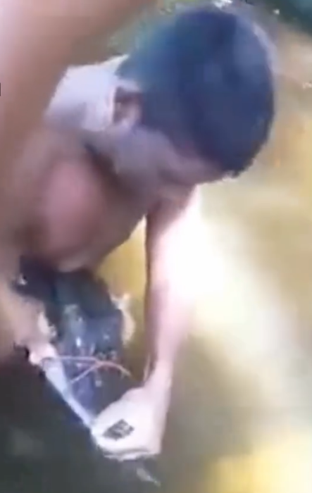 Em seguida, o ribeirinho mergulha em direção ao ponto indicado. Após alguns instantes, ele consegue capturar o jacaré, surpreendendo os amigos que assistiam à situação.